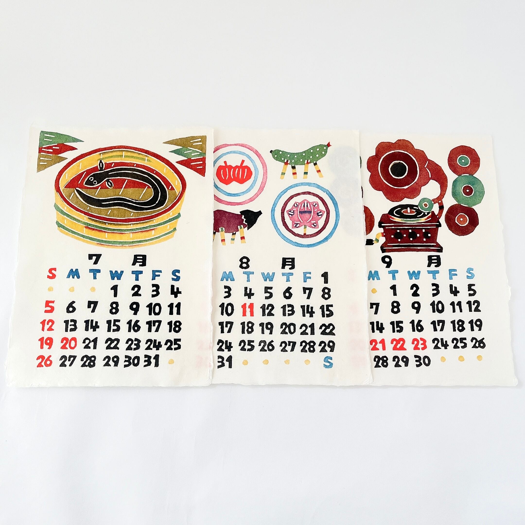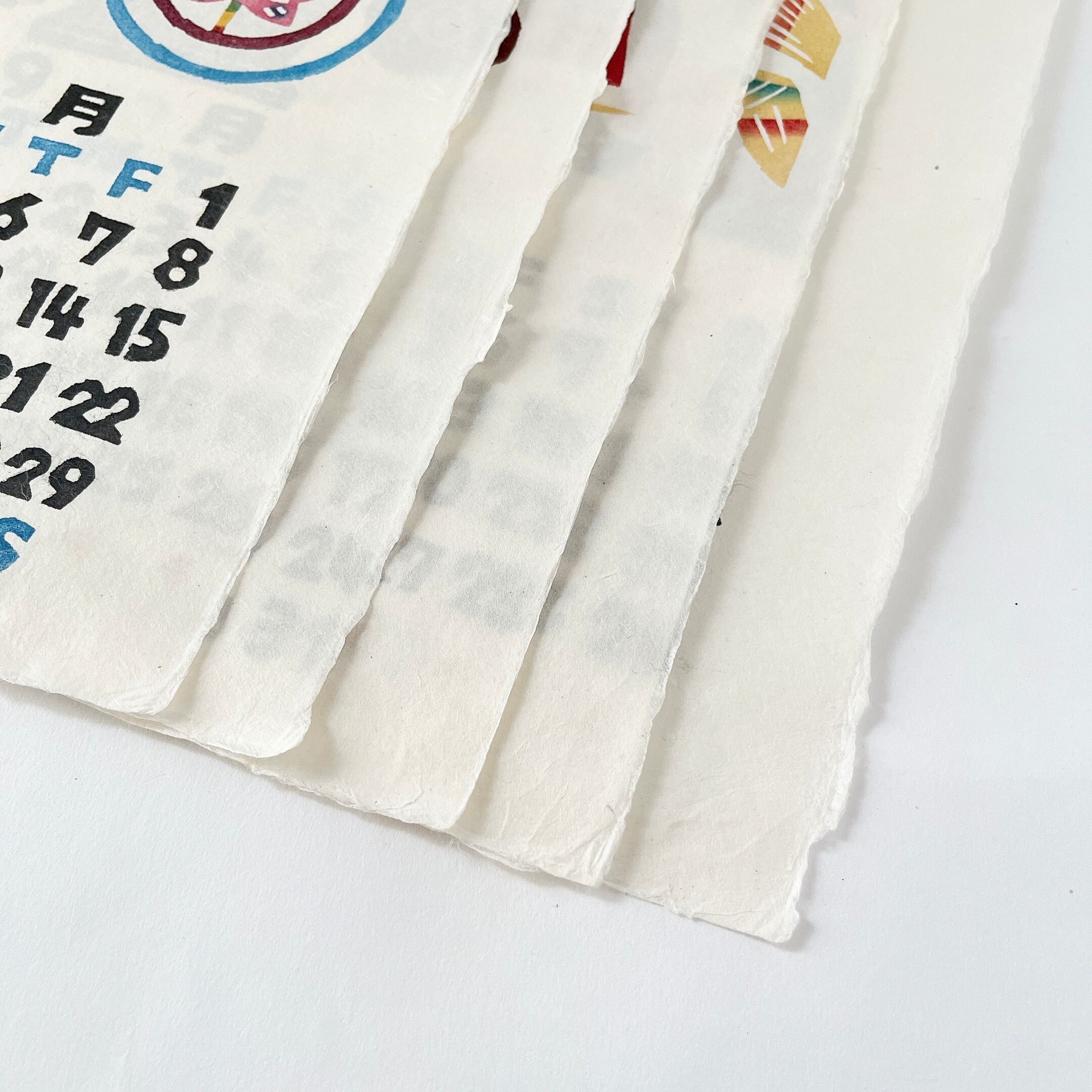 染色工芸家・芹沢銈介氏の元で研鑽を積んだ小田中耕一さんのデザインによる、手漉き和紙に型染めの技法で一枚づつ手染めされたカレンダーです。風習や暮らしの風景、可愛らしい動物が描かれており、小田中耕一さんならではの優しく明るい色彩でユーモアにあふれた暖かみのある意匠です。