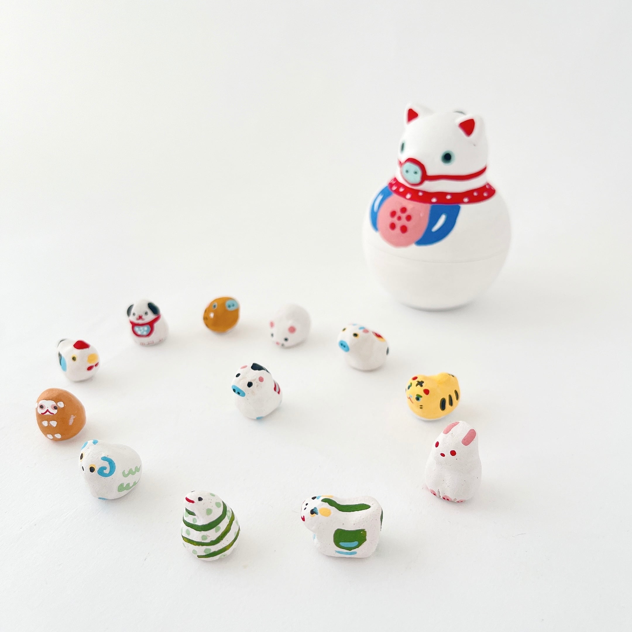 木に絵付された馬の人形の中に、1cmほどの豆人形の十二支が入っており、