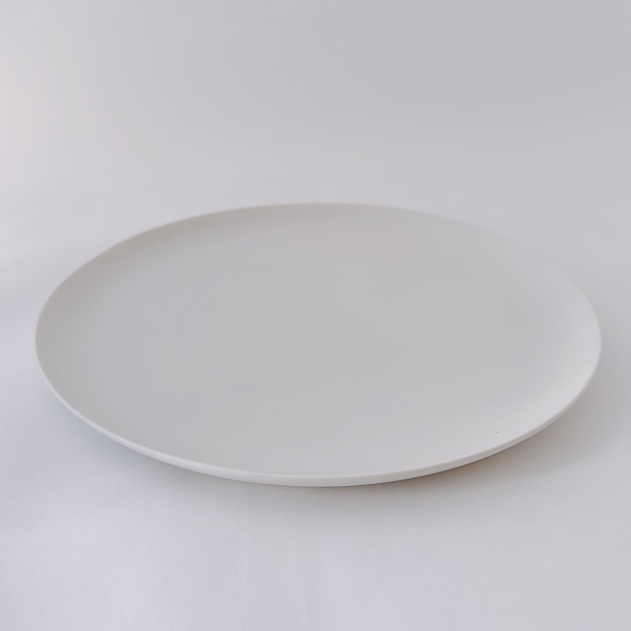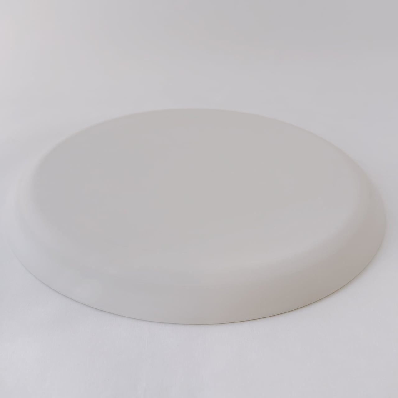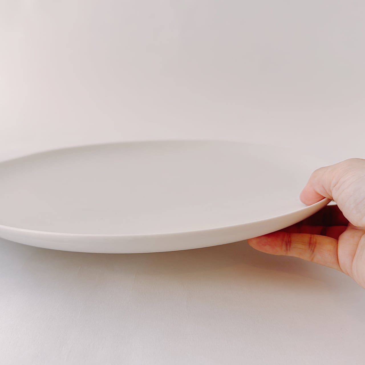 あたたかみのある白が料理を引き立ててくれます。縁の立ち上がりに少し丸みのあるので、料理がすくいやすくなっています。フラット皿なので、ピザやホールケーキにもお使いいただけます。これからの華やかな季節にぴったりです。