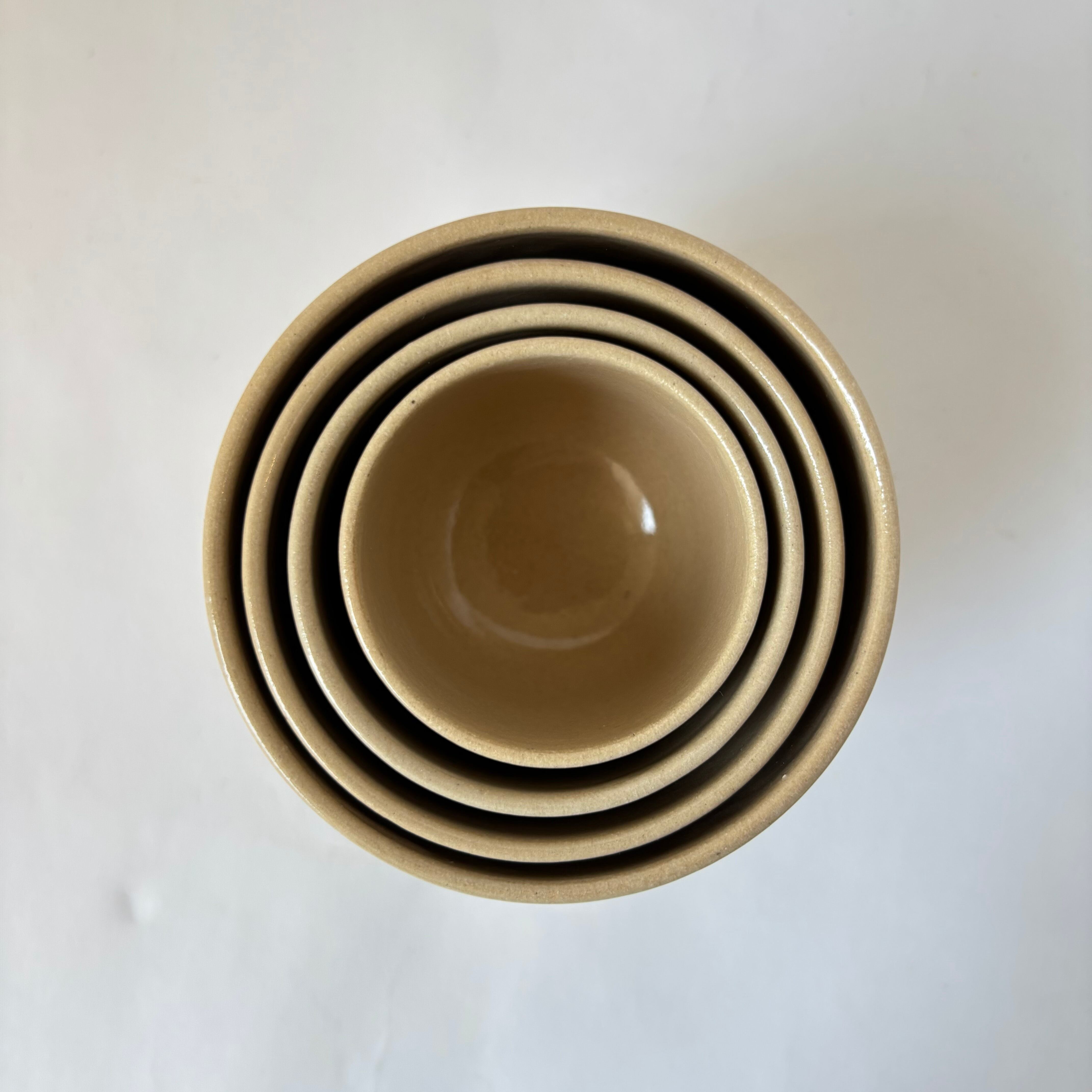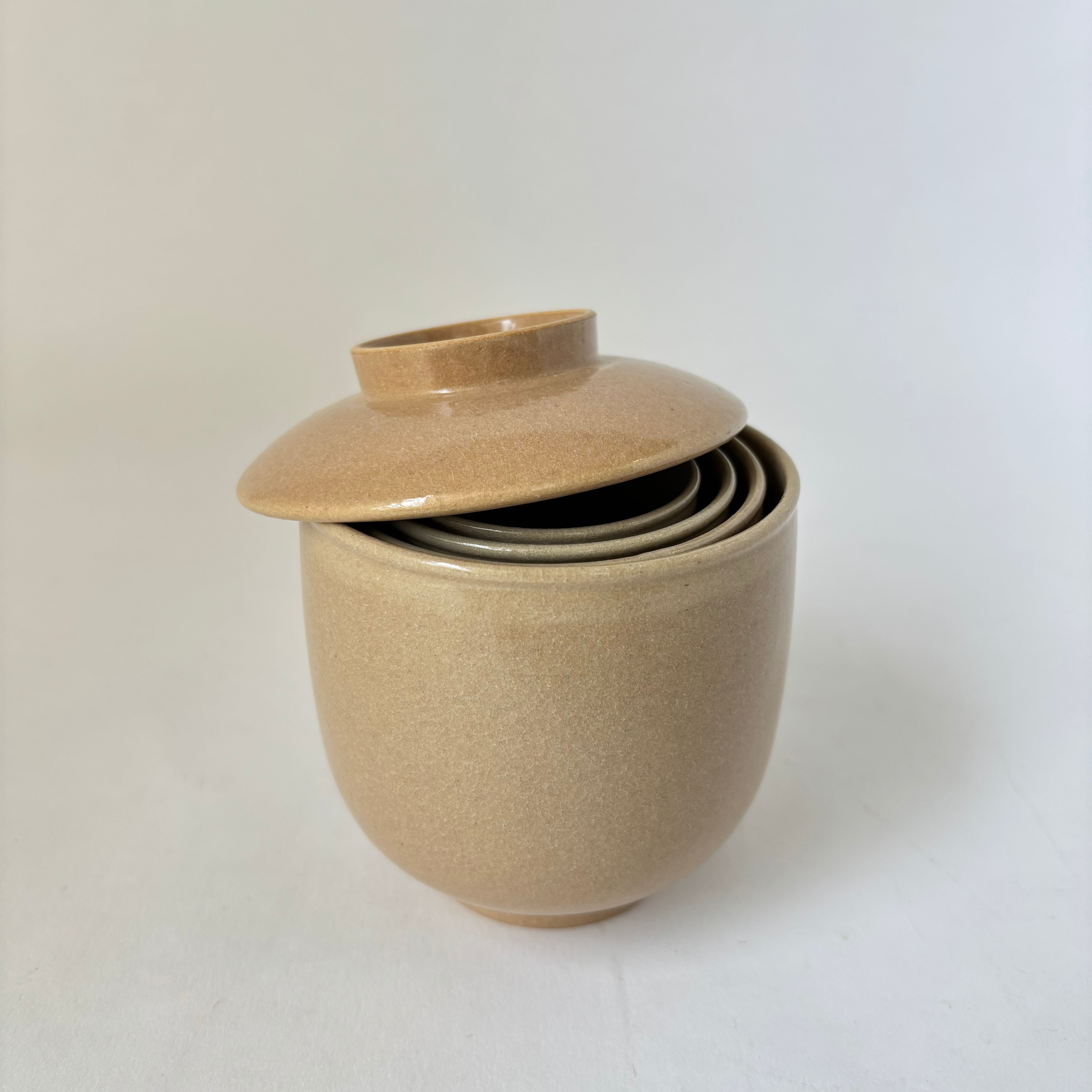 淡いピンクベージュを纏った汲み出し。プレーンな見た目はどこか懐かしさを感じます。経年変化を楽しめるこちらの器は、茶器としては勿論、デザートや小鉢としてもお使いいただけます。サイズ違いと組み合わせれば、入れ子で収納も可能です。