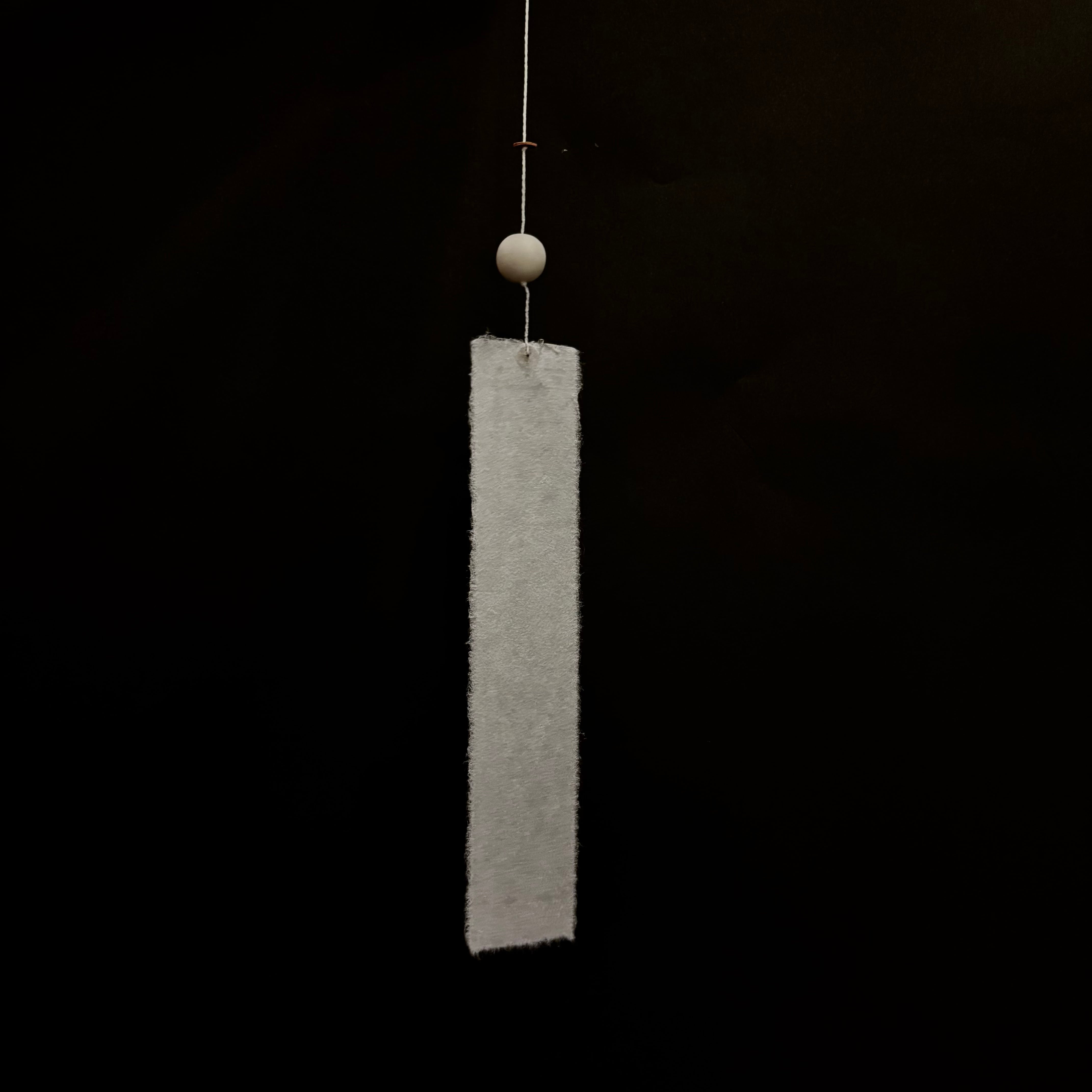 白磁の白が一際美しい風鈴。舌には、急須の茶漉し部分を2つ合わせ球体に。短冊は土佐和紙を使用。こより紐を自身で作成し、ストッパーの革がアクセントになっています。長さの調節も可能です。