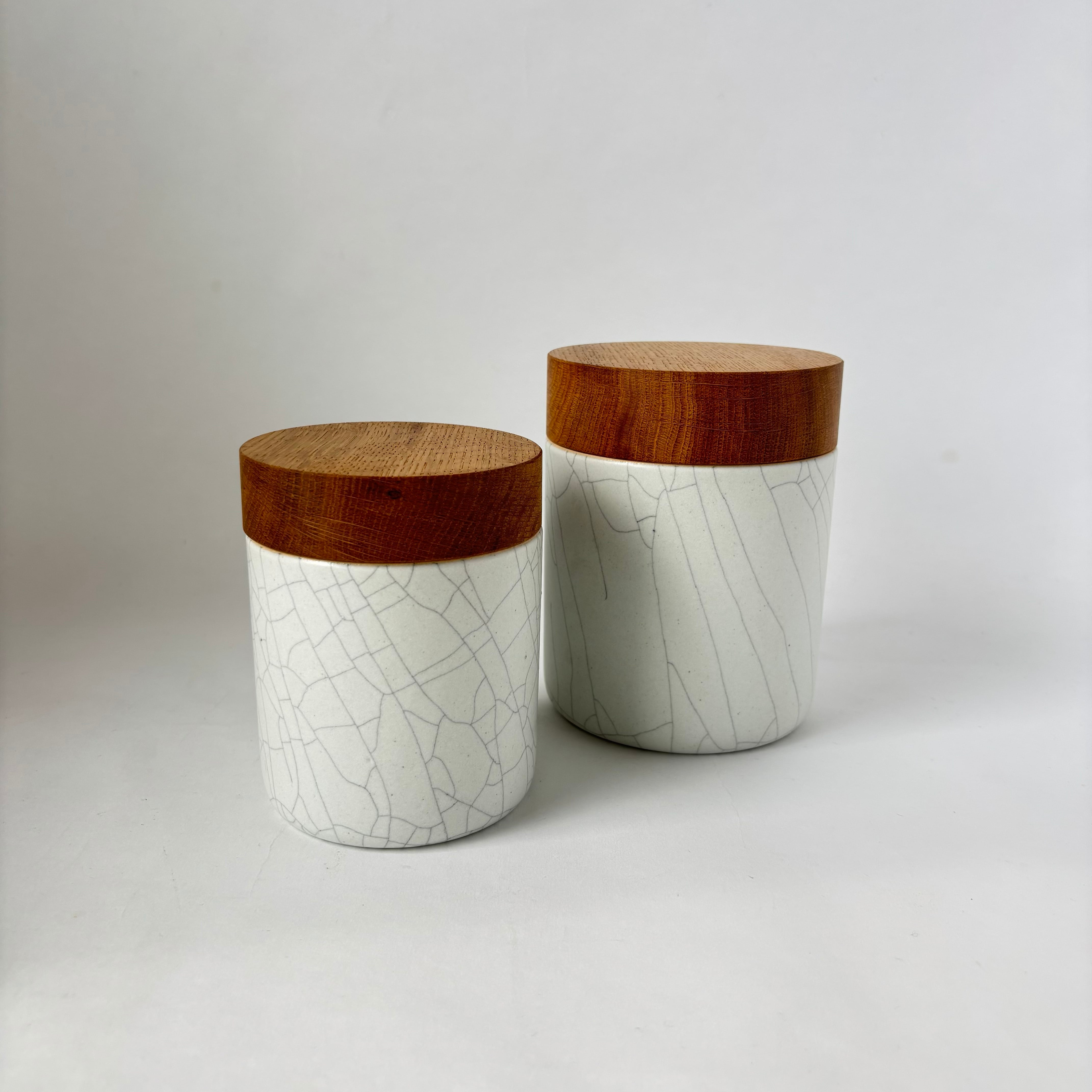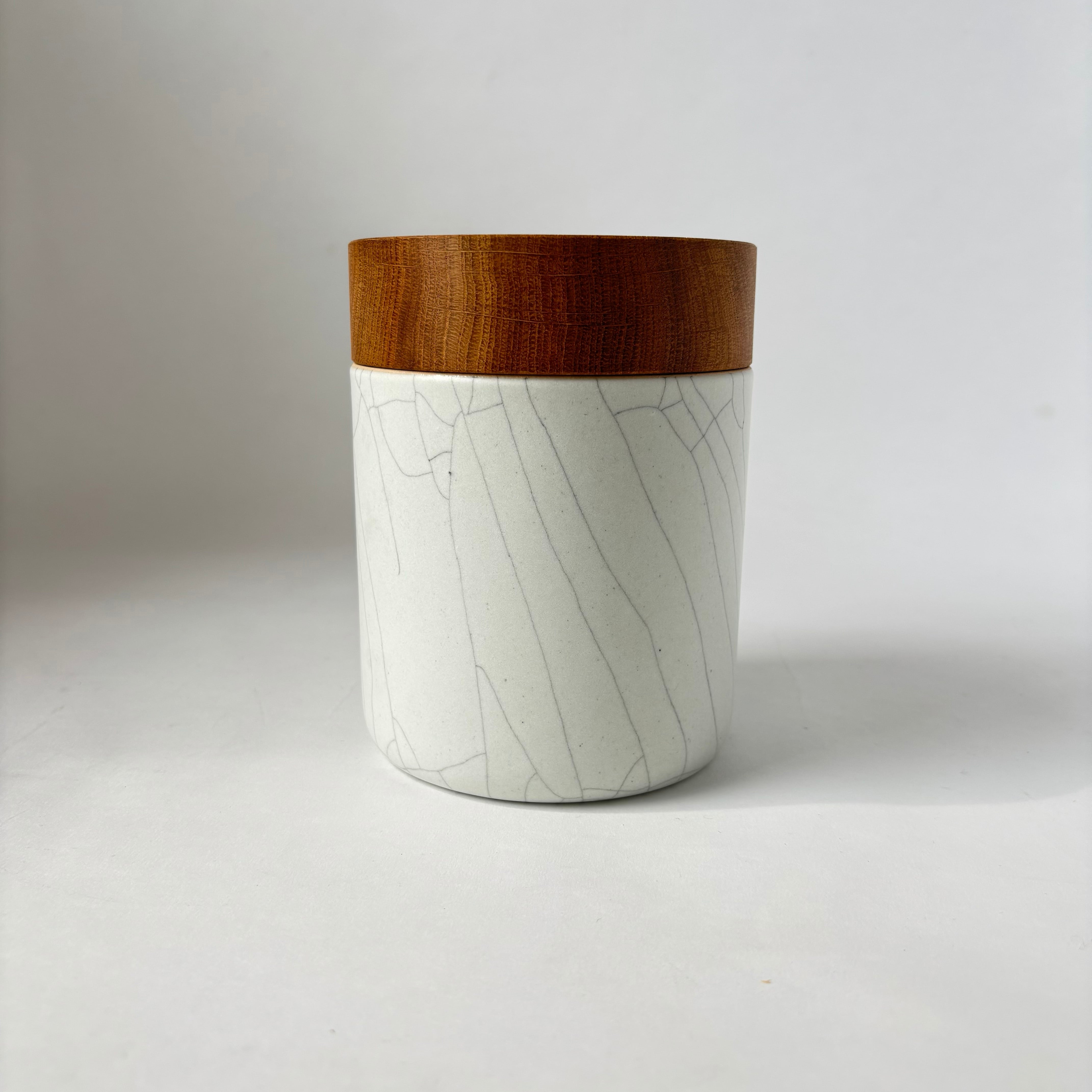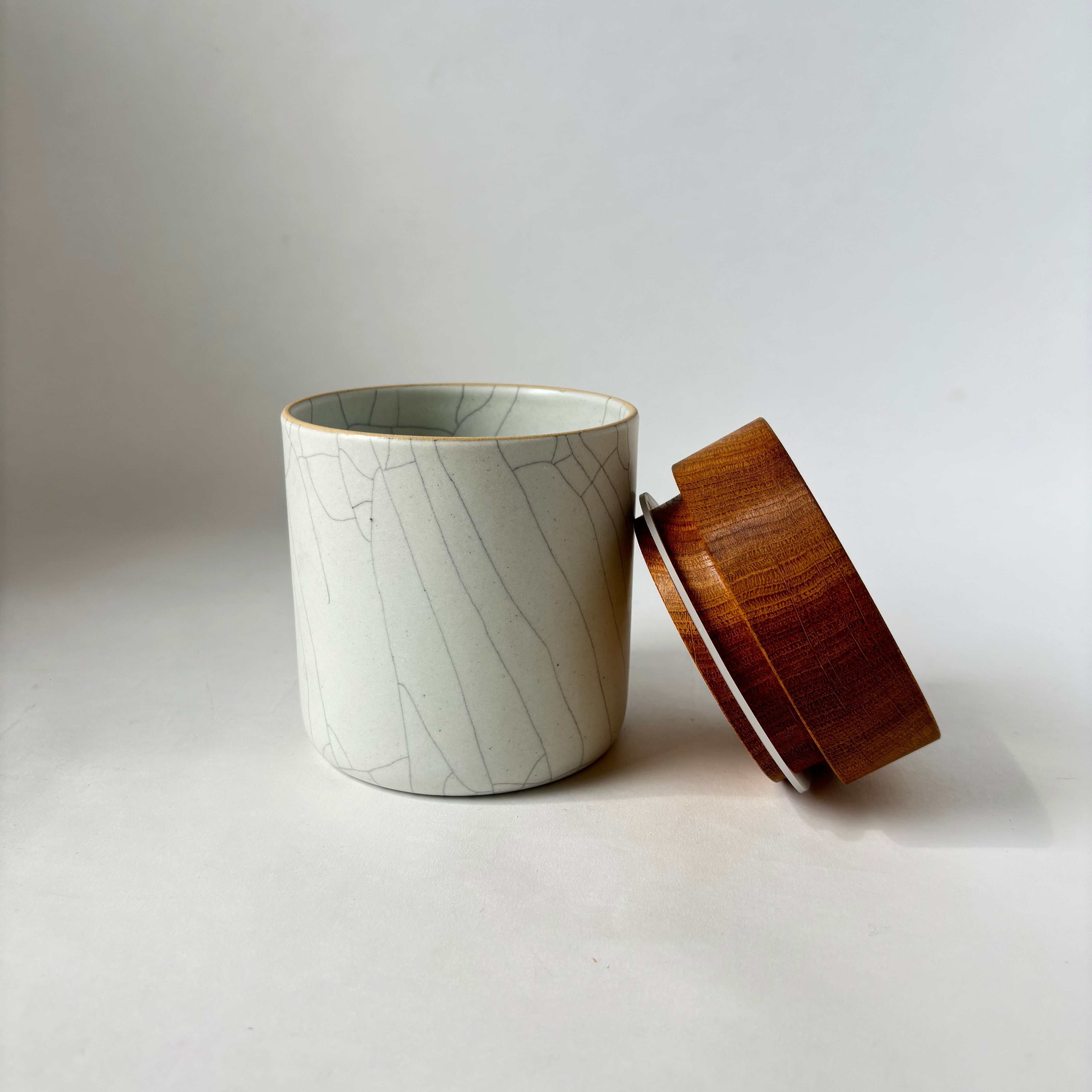 全体に入った貫入が美しい景色となっています。蓋はパッキンが付いており、密閉型となっています。木工家岡部創太さん(COMMON MFG.)との共同作品です。