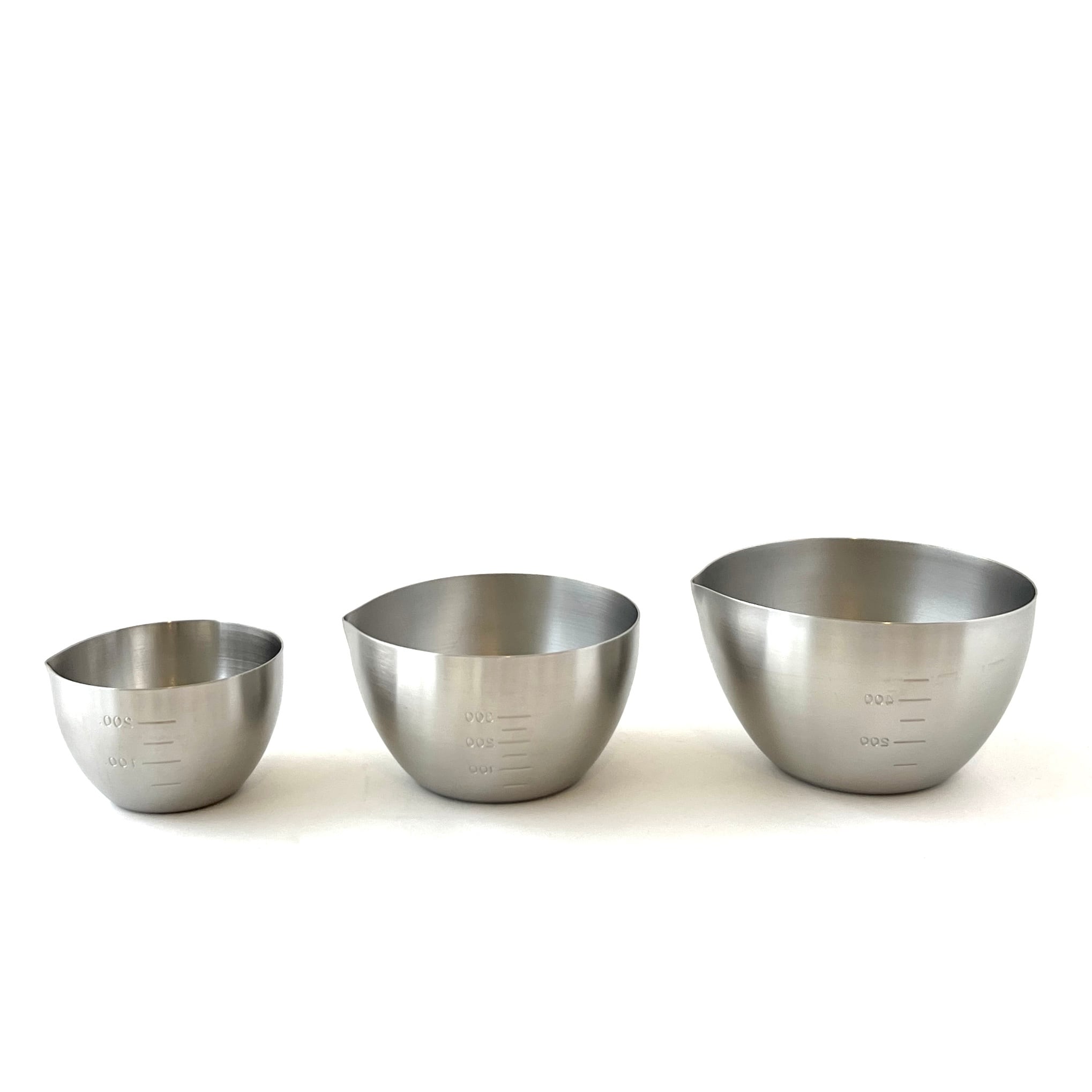 目盛りが付いていているので、ソースを合わせたり、ドレッシング作りも。おおよそ50mlごとに300mlまで計れます。また、そそぎ口が付いてのでボウルから直接注ぐことができます。