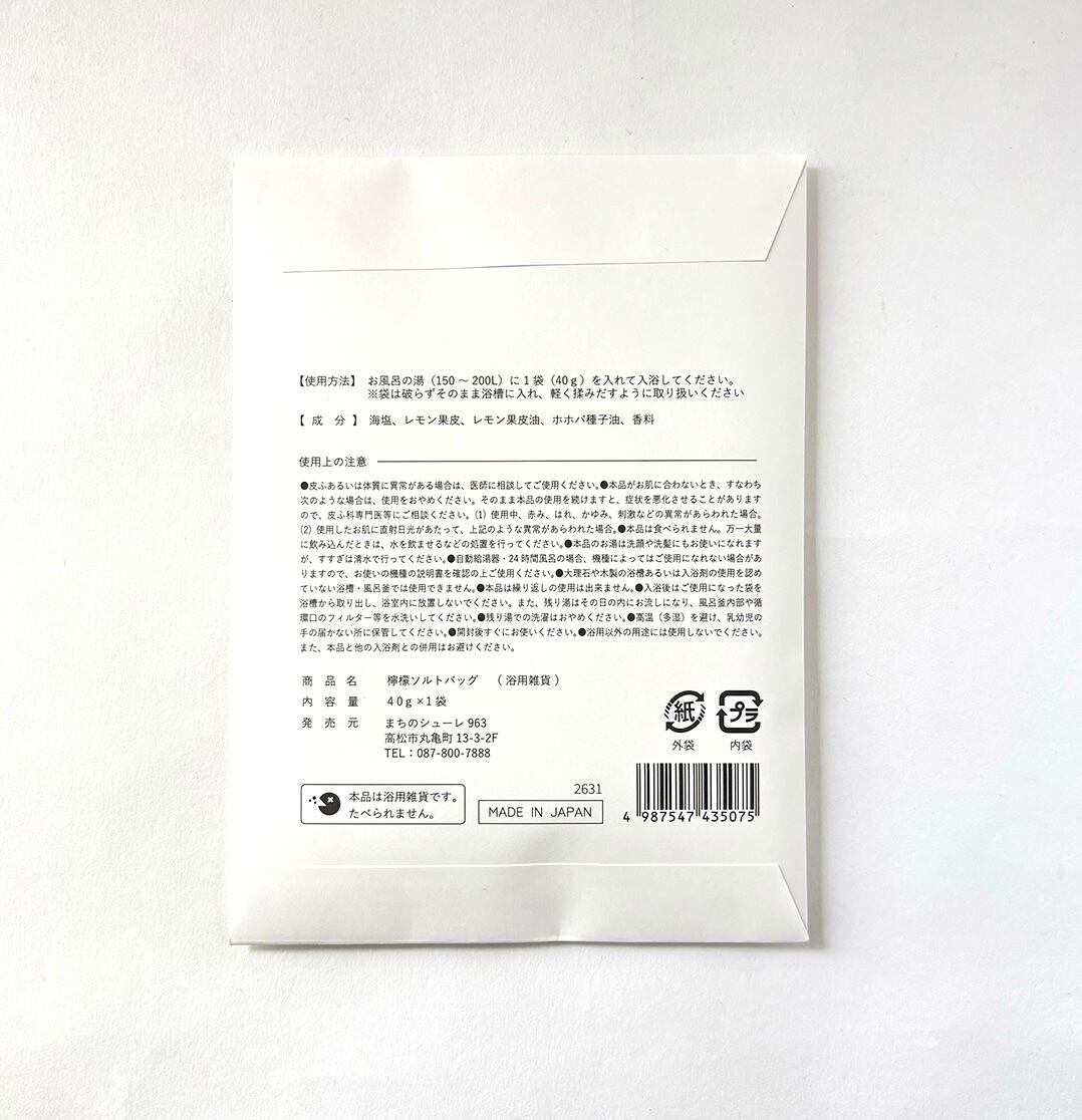 海塩、レモン果皮、レモン果皮油、ホホバ種子油、香料